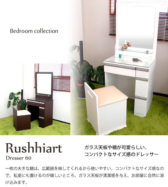 商品 ルシアート ドレッサー60 サイズ(約) 本体:幅585mm×奥行408mm×高さ1410mm、テーブル高さ705mm 椅子:幅360mm×奥行378mm×高さ527mm 内寸 [左側]幅358×奥行306×高さ93mm [右側上段]幅93×奥行306×高さ9.3mm [右側中下段]幅93×奥行306×高さ216mm 素材 MDF+シート貼り MDF+エナメル鏡面仕上げ(ホワイトのみ) 重量 34.5kg 生産 ベトナム 完成品 ミラーのみ取り付け(※下台の溝にはめ込むだけの簡単な作業です) 備考 スマートでシンプルなフォルムは、どの年齢の方にもお使いいただきやすいデザイン。
